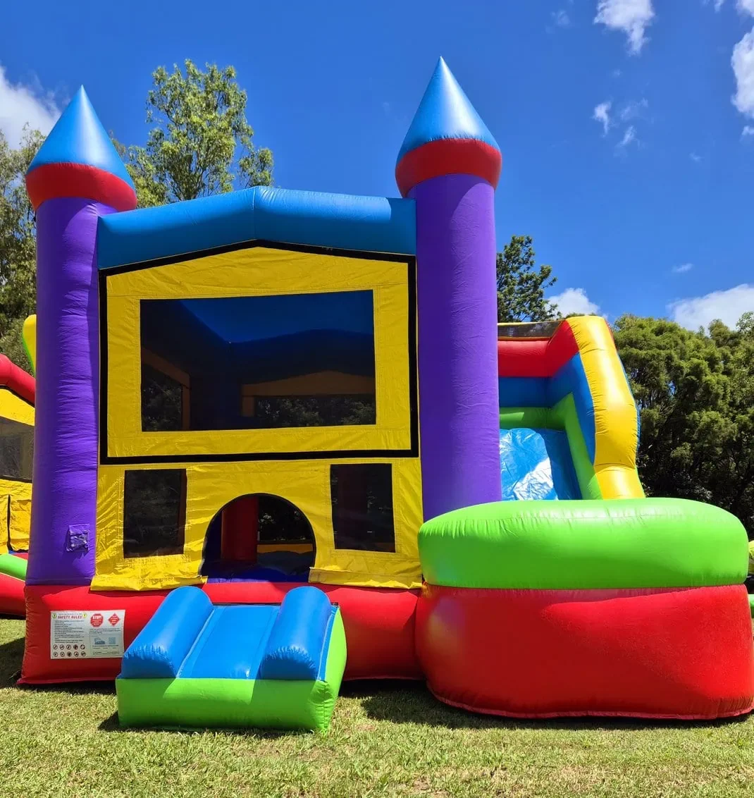 A vibrant, full-shade jumping castle with slide — the ultimate all-in-one party hit for kids aged 1 to 10
